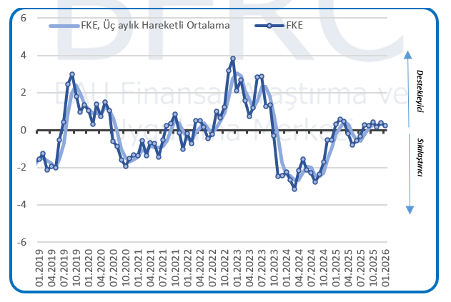 BFRC Finansal Koşullar Endeksi (FKE), 2025 yılı ortasından bu yana olduğu gibi 2026 yılı başında da finansal koşulların ekonomik aktivite üzerinde sınırlı bir pozitif etkisi olduğunu ima ediyor. FKE’nin mevcut seviyesi, TCMB’nin Temmuz 2025’te başlayan faiz indirimlerinin finansal koşullar yoluyla ekonomik aktivite üzerinde henüz önemli bir destekleyici etki oluşturmadığını gösteriyor.